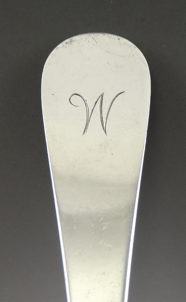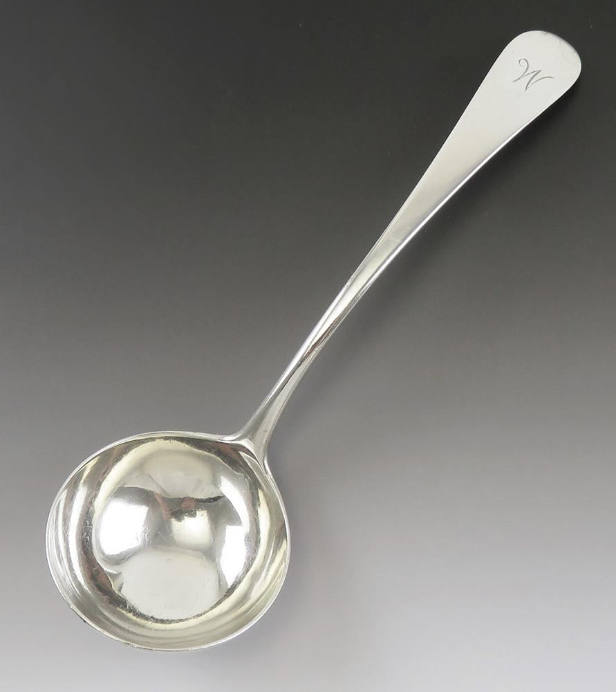 Presented is an antique, American coin silver gravy or sauce ladle made during the early to mid 1700s. We believe this piece was made by Jeffery Lang of Salem, MA. The time period is correct for this maker and the ladle was acquired at an old estate in Marblehead, MA, which is the town next to Salem. This piece is done in a classic, rounded antique pattern and the top of the handle has a monogram of the letter W.