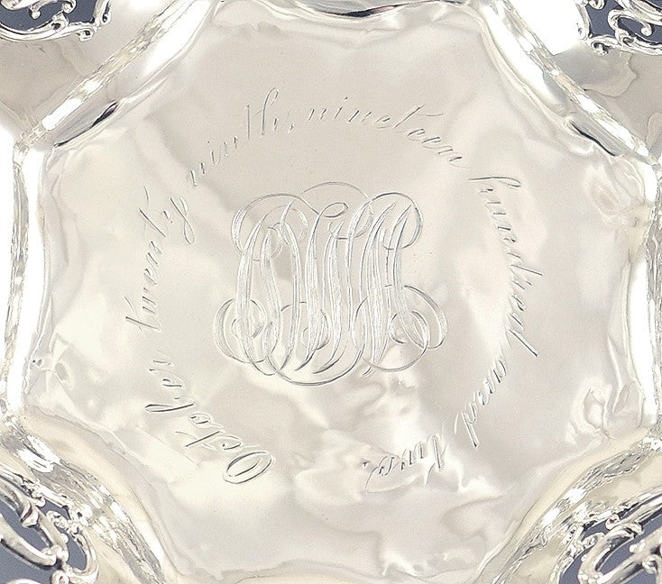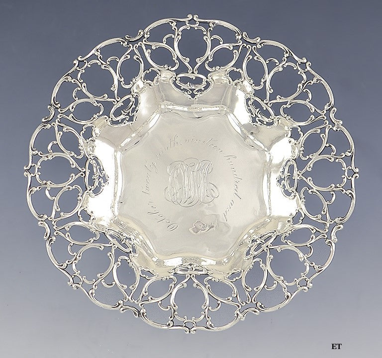 Presented is a beautiful Towle sterling silver bowl with openwork sides. This piece is made in the Aire pattern and dates to circa 1902. The sides of the bowl have an airy openwork design, while the center is solid. The center of the dish has a monogram of OMM in elegant interwoven script. Surrounding this monogram is a presentation date of October twenty-ninth, nineteen hundred and two, spelled out.