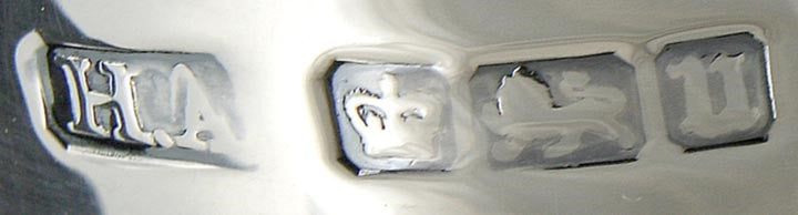 The side is marked with the crown symbol for the city of Sheffield, the lion passant for sterling silver, a date letter n for the year 1905 and a maker's mark HA for Atkins Brothers. The underside of the lid is also marked with HA and the lion passant.
