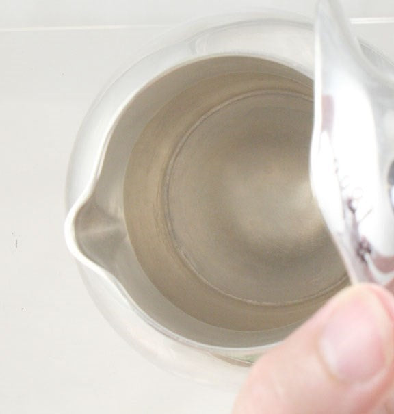 The pot measures 5 3/4 inches from handle to tip of spout, is 6 5/8 inches tall and weighs 382 grams or 12.3 troy ounces.