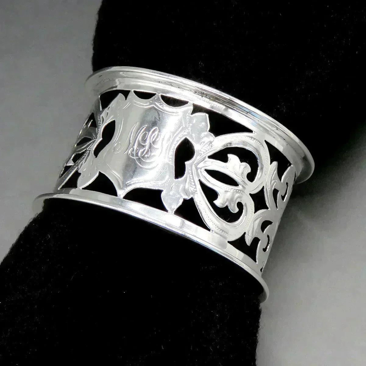 Presented is an antique, English sterling silver napkin ring made by Henry Charles Freeman of Birmingham in 1909. This wide napkin ring is done in a pierced or openwork form and the scrolling designs are engraved. The front has a monogram of the initials MSP in a shield cartouche.