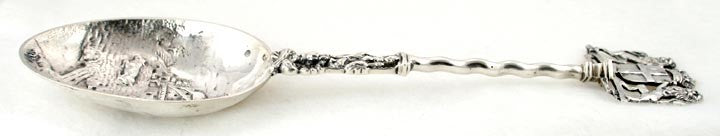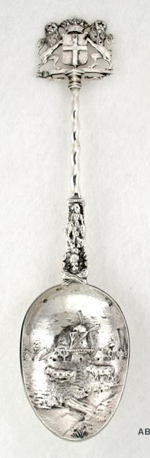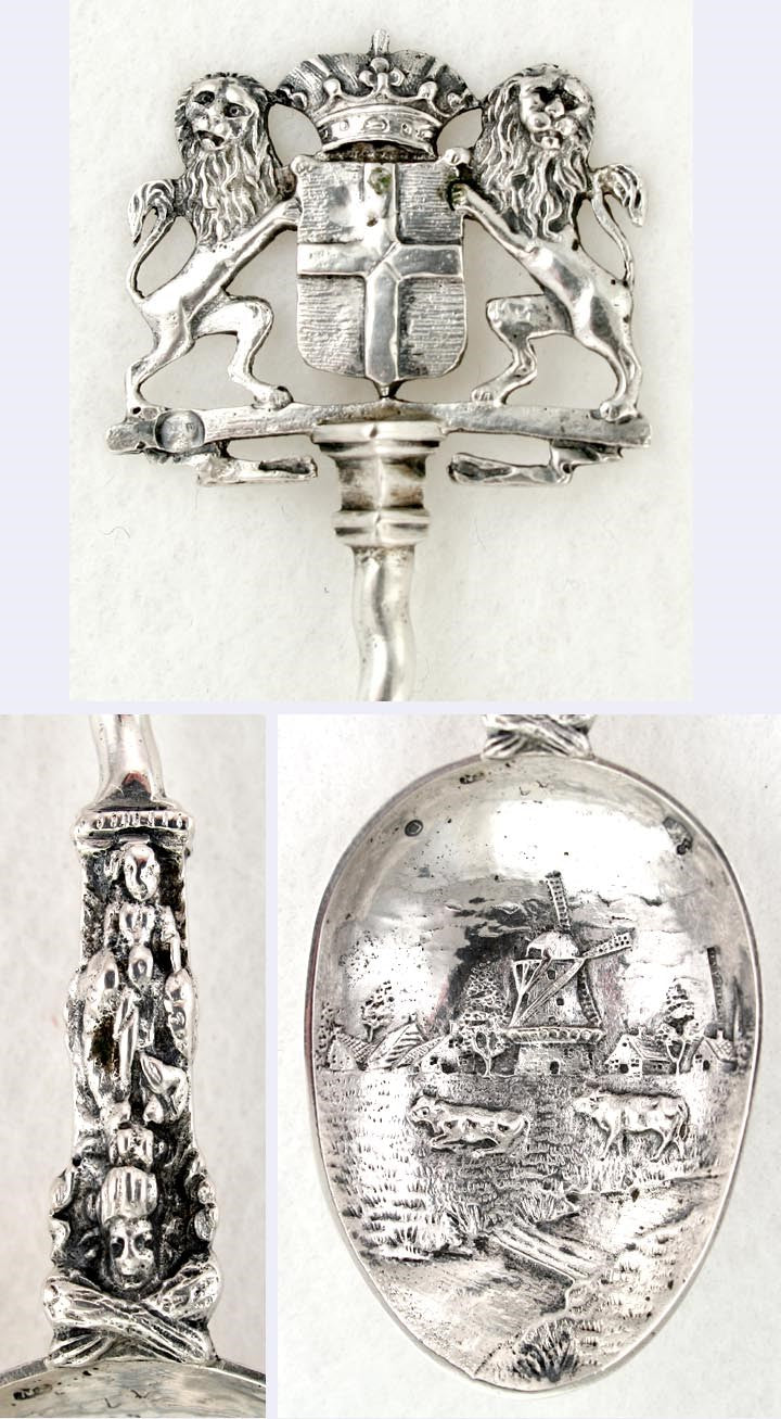 Presented is a fine quality Dutch silver serving spoon. This spoon is substantial and has good weight. There is a beautiful high relief farm scene on the bowl, and a lion crest on the top of the handle. The crest on the top of the handle probably represents a city in the Netherlands.