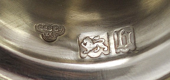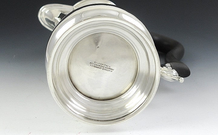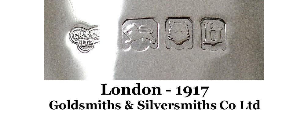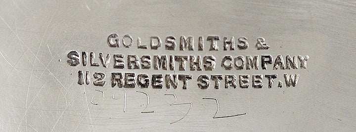 This piece is hallmarked on the side with the lion passant for sterling silver, the leopard's head for the city of London, the date letter b for 1917, and the maker's mark for the Goldsmiths & Silversmiths Co. Ltd. The interior of the lid is hallmarked with the maker's mark, the lion passant, and the date letter. The underside of the pot has the name and address of the company spelled out, "Goldsmiths & Silversmiths Company 112 Regent Street W."