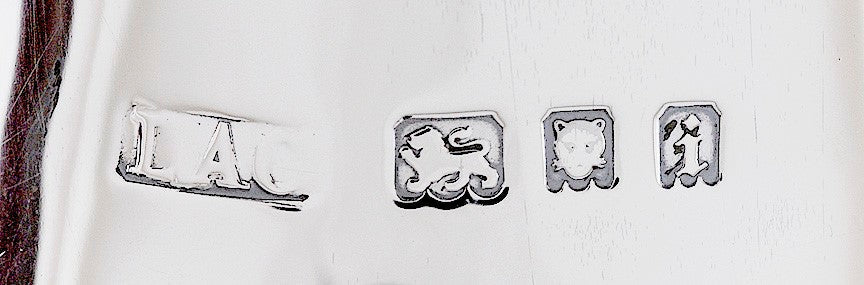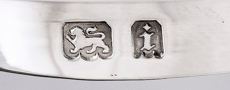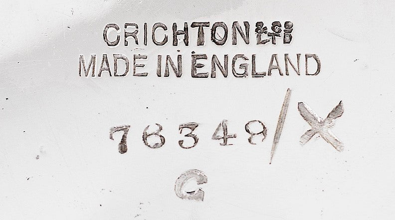 This piece is hallmarked on the side with the lion passant for sterling silver, the leopard's head for the city of London, the date letter i for 1924, and the maker's mark for the Crichton & Co Ltd. The interior lip of the lid is also hallmarked with the lion passant and the date letter. The underside of the pot is stamped with Crichton & Co Ltd and Made in England.