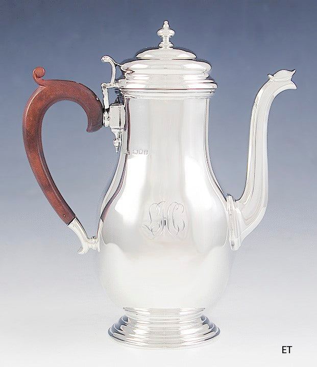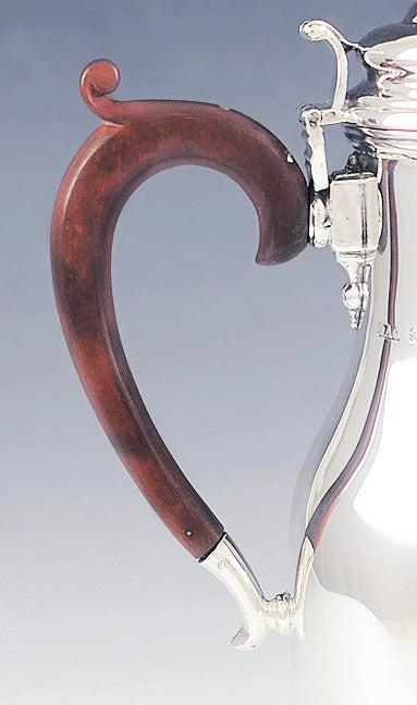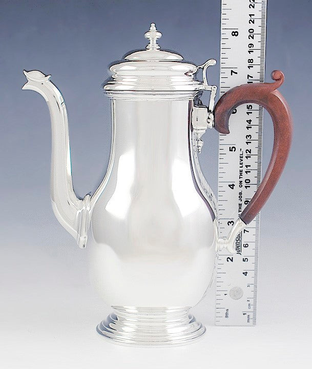 Presented is a fine English sterling silver coffee or demitasse pot. This pot dates to1924 and was made by Crichton & Co Ltd. The pot is done in a classic form, copying much older English styles. The pot has a beautifully carved wooden handle with a C scrolled design. The pot is monogrammed LHC on the side in elegant script. This is a sturdy, well made silver pot with a wide variety of uses.
