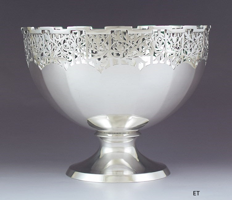 Presented is a fabulous English sterling silver centerpiece bowl. This piece dates to 1924 and was made by Edward Barnard & Sons Ltd. The bowl is done in a handsome form with paneled sides and a crenellated rim. Around the upper portion, the bowl is beautifully pierced with decoration in the form of scrolling vines and foliage against a vertical trellis-like design.