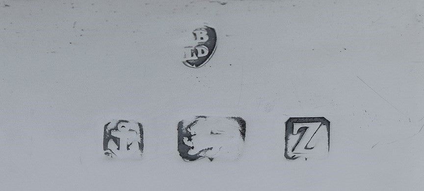 This piece is hallmarked on the side with the lion passant for sterling silver, the anchor for the city of Birmingham, the date letter Z for 1924, and the maker's mark for Edward Barnard & Sons Ltd.