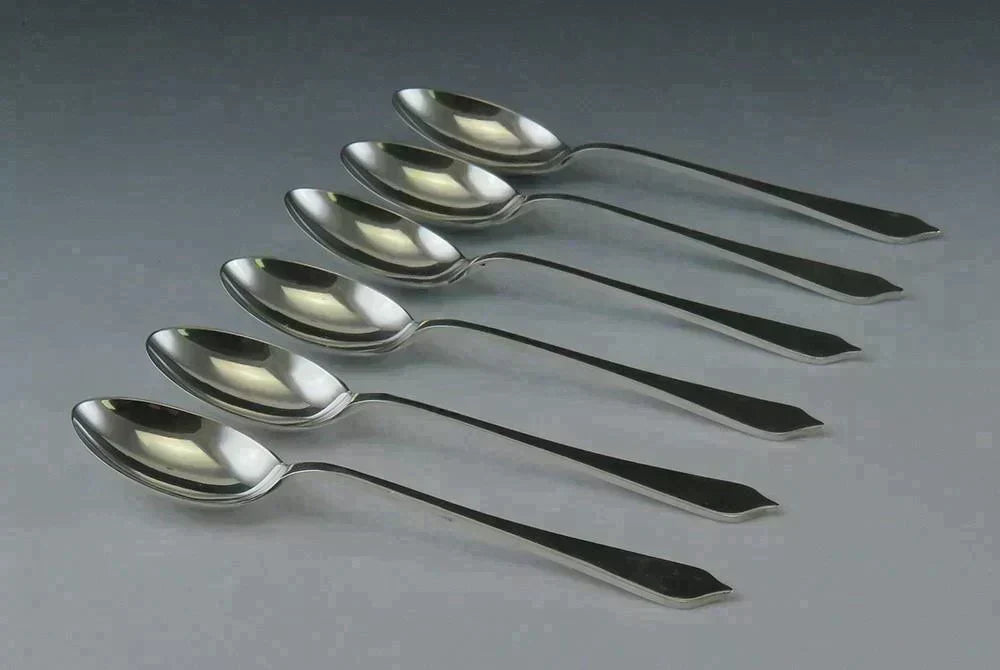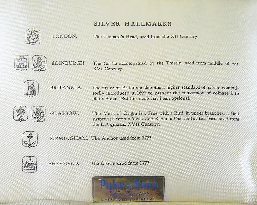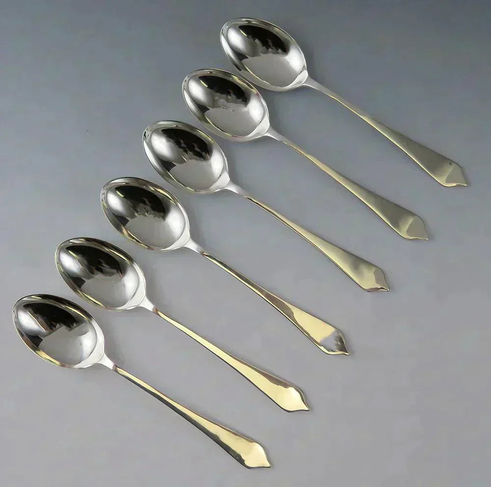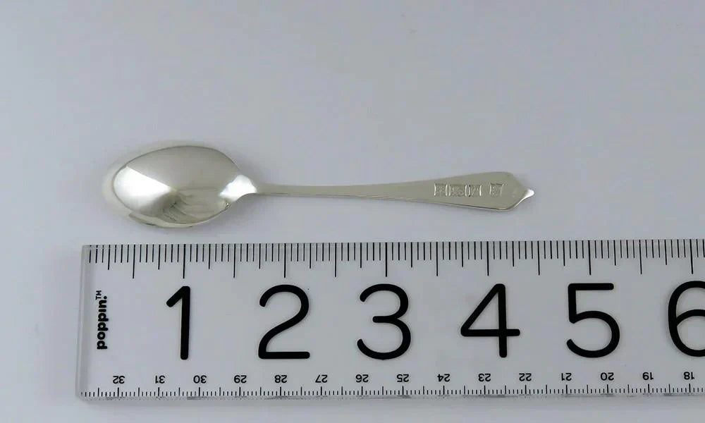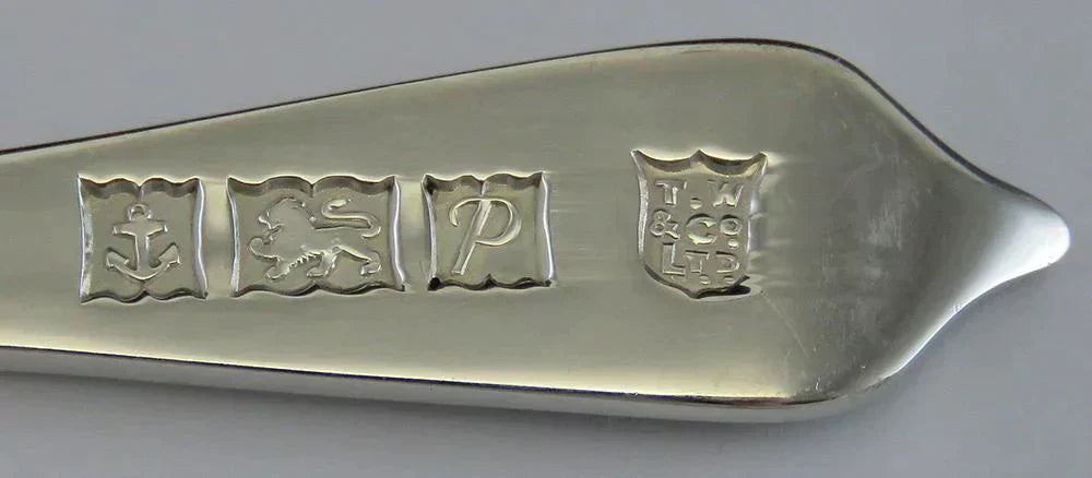 Each spoon is marked with a city symbol, the lion passant for sterling silver purity, a date letter for the year 1964 and a maker's mark for Travis, Wilson and Company.