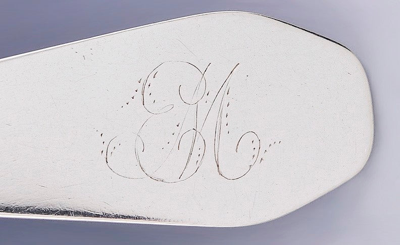 Presented is a fine old American coin silver spoon. This piece was made by Marcus Merriman & Co of Connecticut, and dates to the early 1800s. The spoon is done in a simple style, with a cut corner, almost dog-nose design to the end of the handle. The terminal of the handle has a monogram of EM in elegant script.