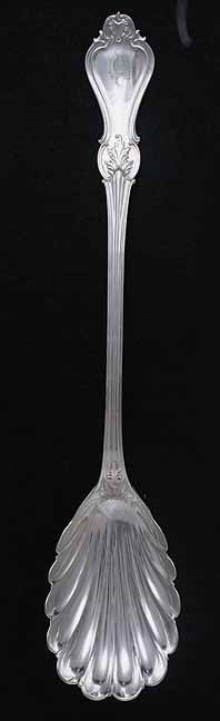 Presented is a great and huge American coin silver serving spoon or platter spoon by the New York City makers, Alcock & Allen. This huge spoon is done in a classic pattern of leaves and scrolls with a crest on the tip of the handle in the form of a modified fleur de lis. The spoon is monogrammed on the back of the handle with MALR in Gothic script.