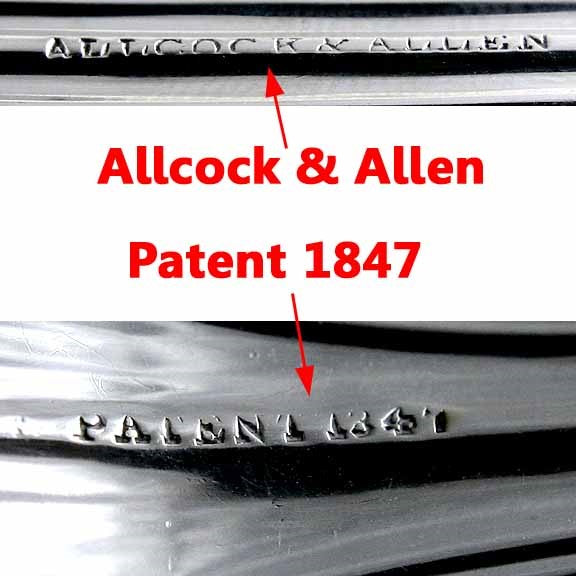 The spoon is hallmarked on the reverse with Alcock & Allen for the maker and Pat. 1847. We have tested this piece and guarantee it to be coin silver.