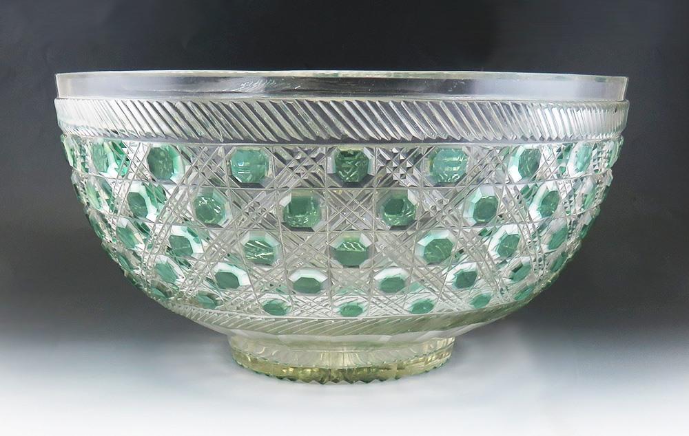 Antique 19th Century Bohemian Czech Cut Green to Clear Glass Punch Bowl