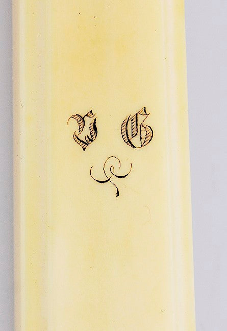 Presented is a great set of three French 950 silver and bovine/cow bone serving pieces. These pieces date to the mid to late 1800s. The set consists of a solid bladed server, a heavily pierced spoon, and a pierced bladed server. The business end of each server is made from French first standard silver, which is a higher purity than sterling 925. The handles are carved from bovine/cow bone, with visible natural graining and crosshatching and a beautiful mellow patina. Each handle is engraved and inked with the initials VG in Gothic script.
