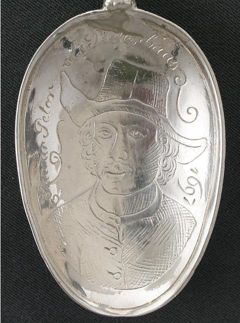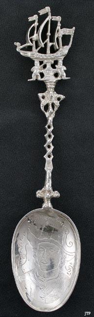 Presented is a fine German silver spoon. The tip of the handle is done in the form of an elaborate ship. The ship is perfectly three-dimensional. The front of the bowl is engraved with a portrait of a man, and the back of the bowl is engraved with a crest. The spoon was made in the late 1800s.