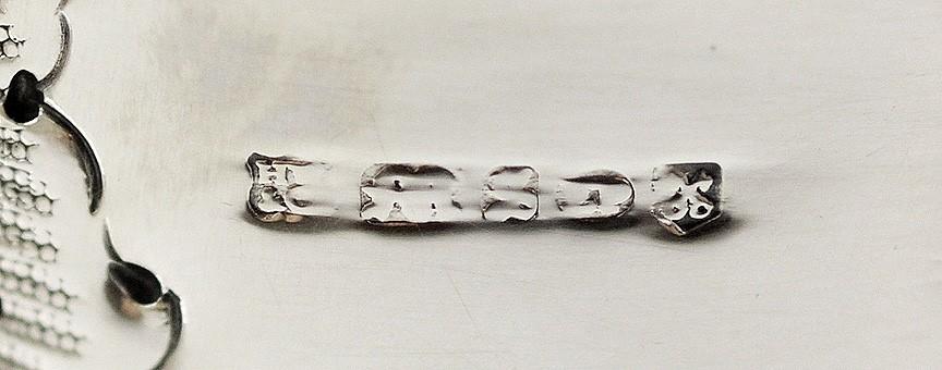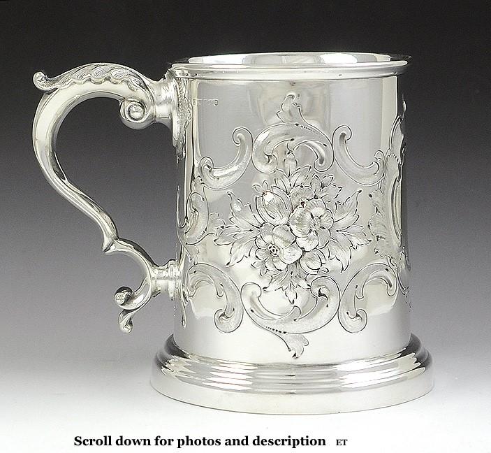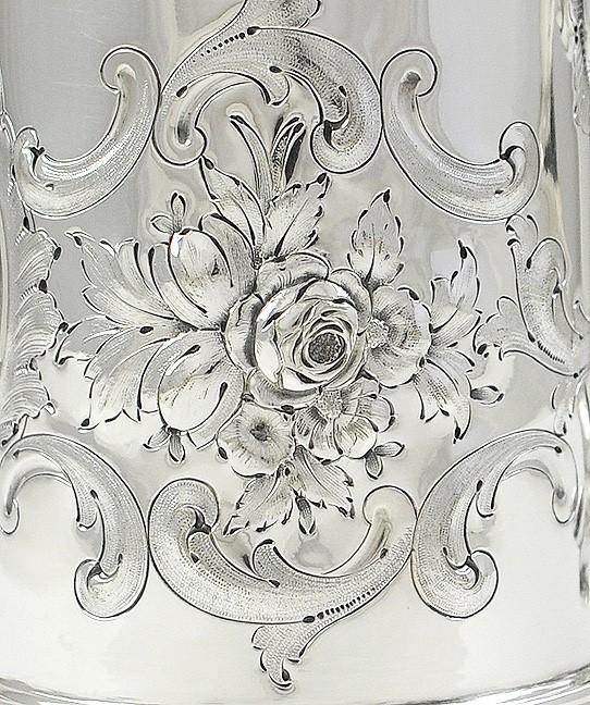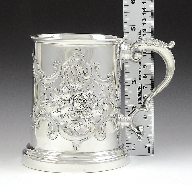 The mug is in excellent condition. The hand chasing is still crisp. The glass bottom has a few minor scratches but they are hardly noticeable. There are no splits, no breaks, no monograms, no monogram removals, and no repairs.