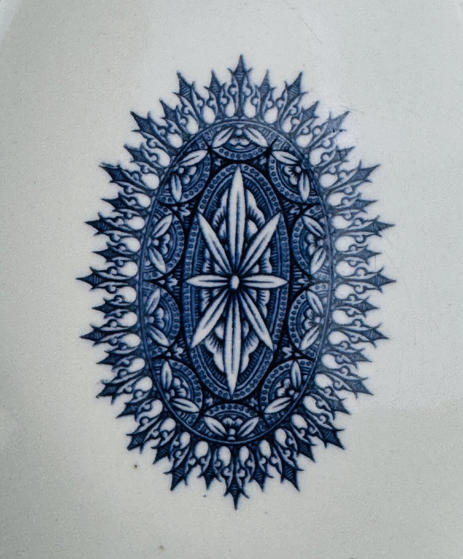 The small oval bowl measures 9 by 6 3/4 by 1 5/8 inches. The bowl measures 7 3/4 x 6 1/2 inches.