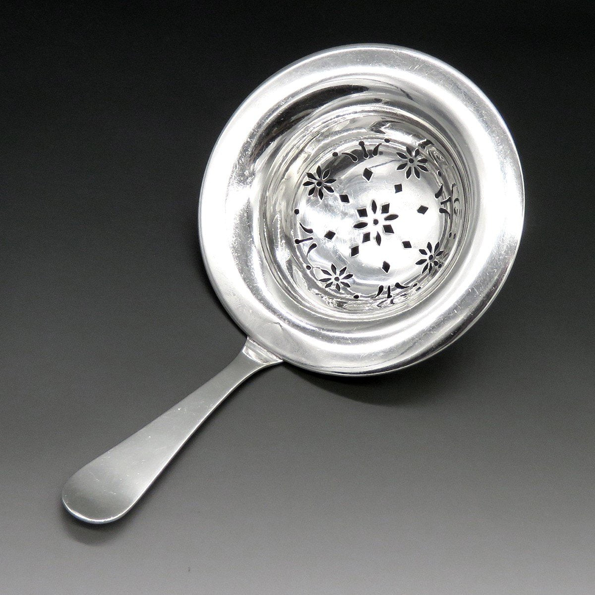 Presented is an antique sterling silver loose-leaf tea strainer made in America c1910 to c1920s. The strainer has a large bowl with a wide rim and has a good weight for the piece. The center is pierced with large flowers and diamond shapes, allowing for easy straining. The strainer has never been monogrammed.