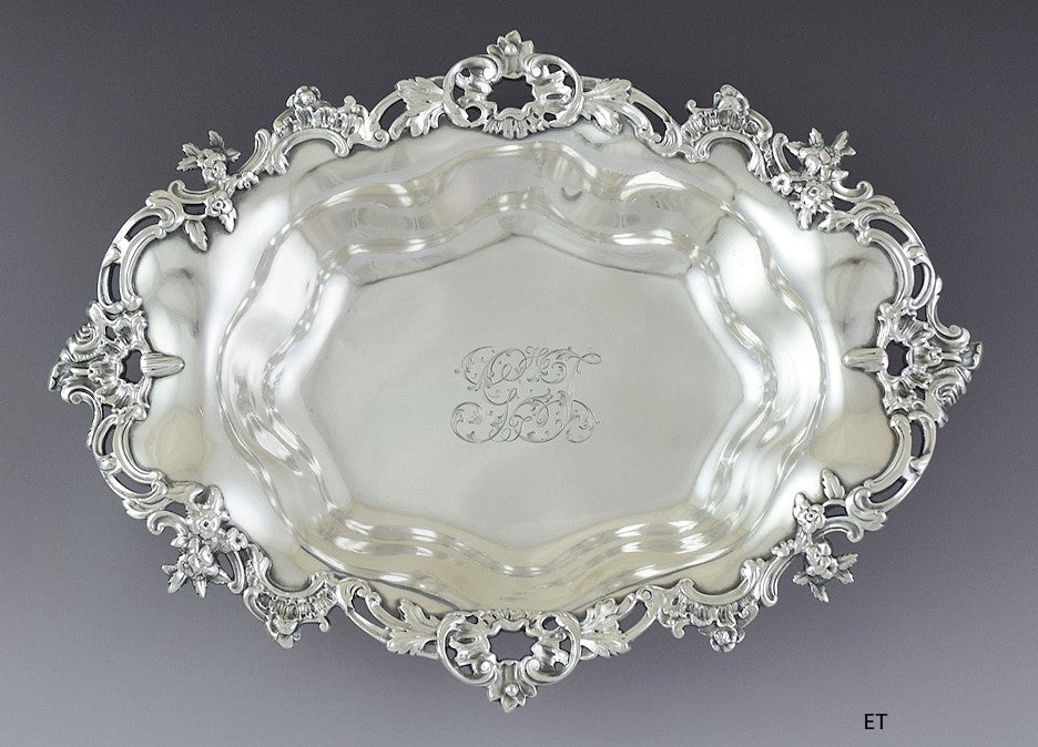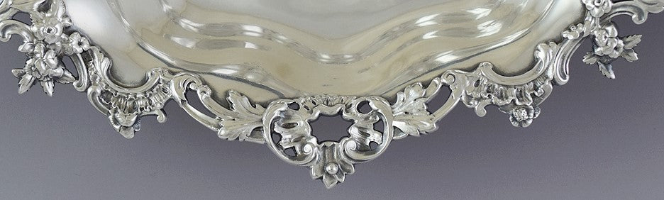 Presented is a fabulous Gorham sterling silver bowl, dated 1892. The bowl is beautifully decorated with an openwork rim of fancy foliage, flowers, and scrolls. The rim is separately cast and applied, so the designs are quite detailed and nicely textured. The center of the bowl has a monogram of GT, with a smaller H and T above and below.