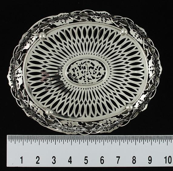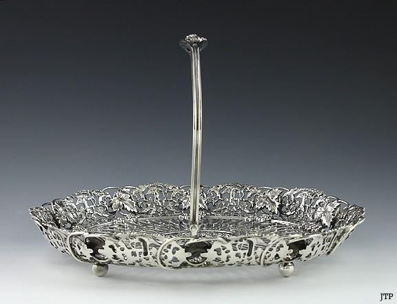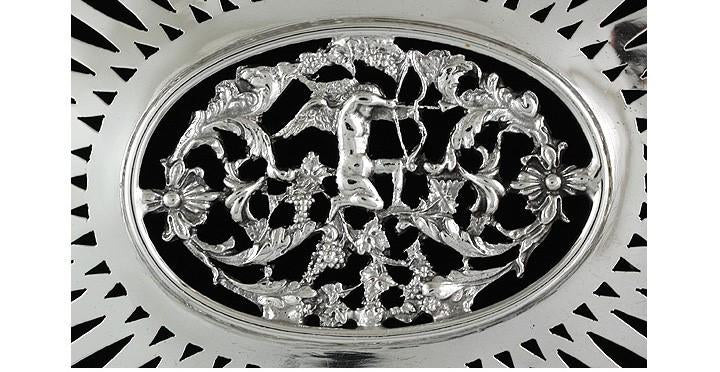 Presented is a wonderful quality, heavy weight swing handle sterling silver basket retailed by J. E. Caldwell & Company. The basket is raised up on four ball feet and has an elegant openwork design. There are detailed medallions around the sides of the basket depicting a cupid shooting an arrow framed in ornate clusters of grapes, vines, and leaves. All of these intricate designs have been individually cast and separately applied. The casting is exceptionally well done and quite heavy. The bottom of the basket has geometric pierced work with the cupid design repeated at the center. The swing handle is adorned with an applied cluster of grapes and leaves. The basket was most likely made in the late 1800s or early 1900s.