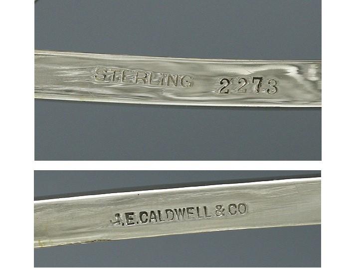 The basket is marked on the inside of the handle with J. E. Caldwell & Co. for the retailer, Sterling and the product number 2273. The entire piece is guaranteed to be sterling silver. This is the third or fourth time I have had this exact same design. This basket was made in two different sizes, the size you see here and a smaller size. Two of the previous baskets I have owned were stamped by the maker, Howard & Co.. This piece was undoubtedly made by Howard & Co. in their name was probably left off at the retailer's request.