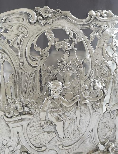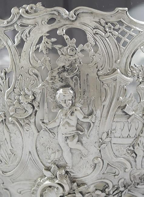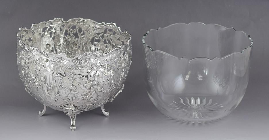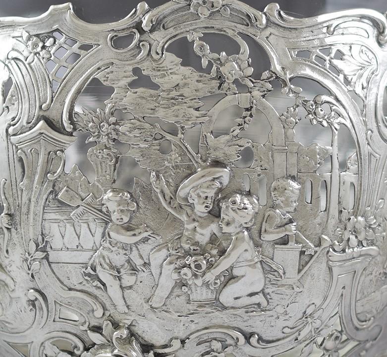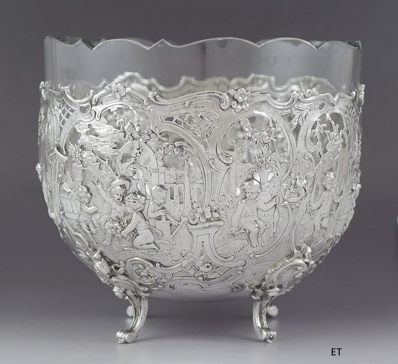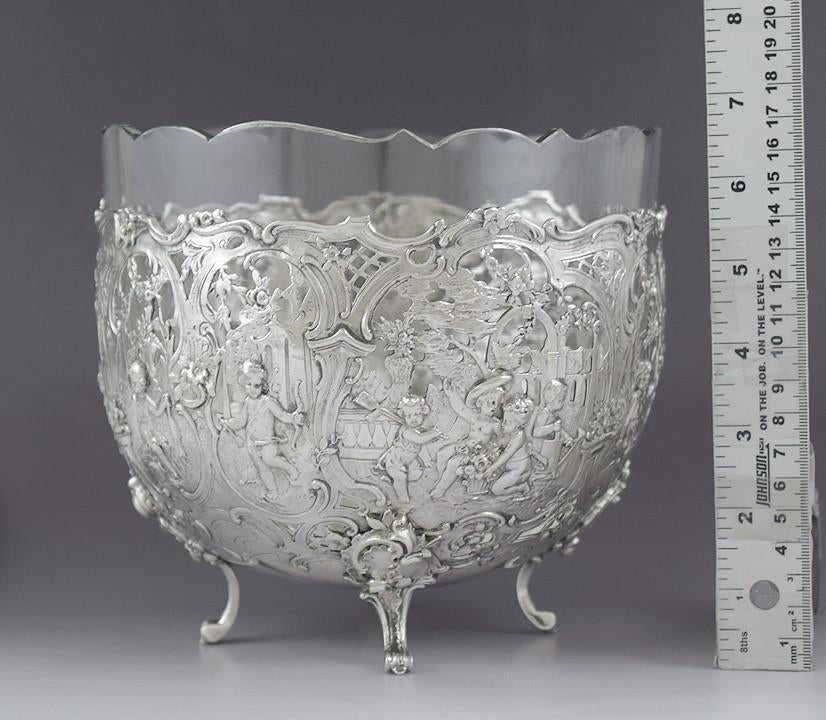 Presented is a fabulous German silver and cut glass bowl. This piece was made by Storck & Sinsheimer and dates to circa 1900. The bowl done in a beautiful openwork design, with a cut glass liner. The glass portion has a decorative edge, done in elegant swooped and pointed shapes around the rim. The silver portion is ornately decorated with cherubs engaged in various activities like gardening and fishing, surrounded by classical floral and scrollwork decoration. The bowl stands on four scroll form feet.