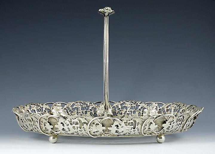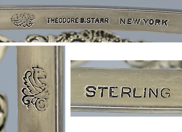The basket is marked on the inside of the handle with the maker’s mark for Theodore B. Starr, New York, Sterling and a product number. Everything on this entire piece is sterling silver.