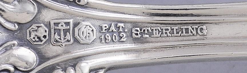 The stem of the piece is stamped with the Gorham maker's mark, sterling, and the patent date of the pattern, 1902. There is also a retail mark for William Wise & Son.
