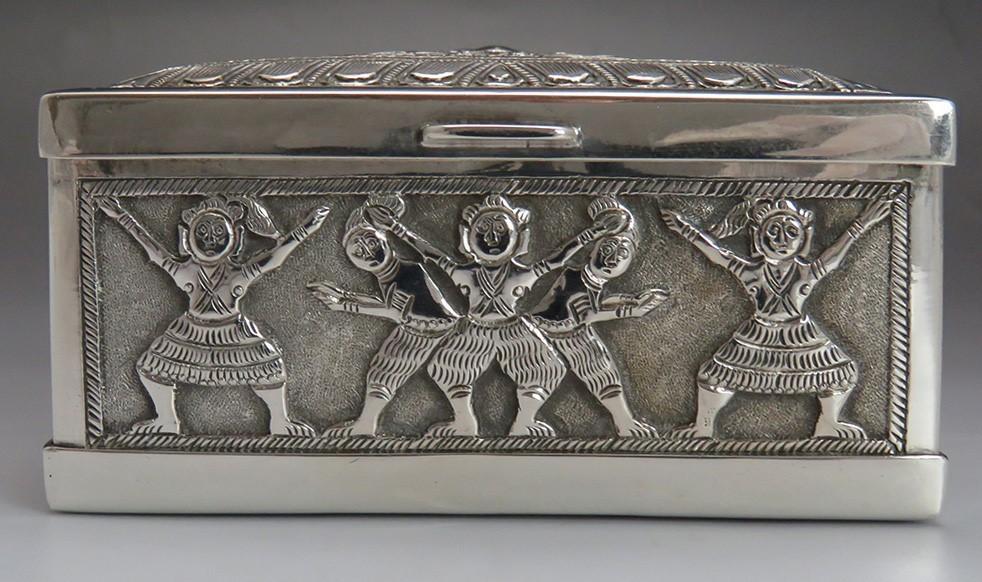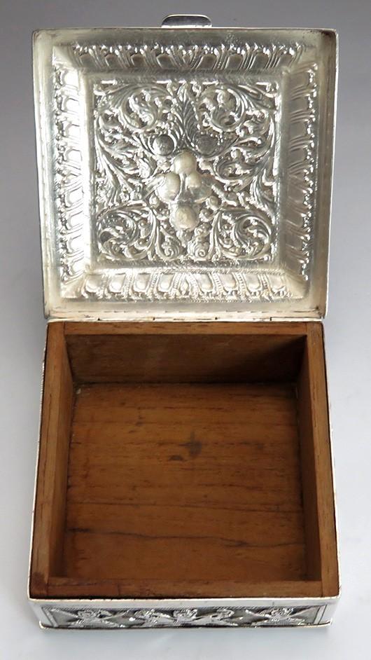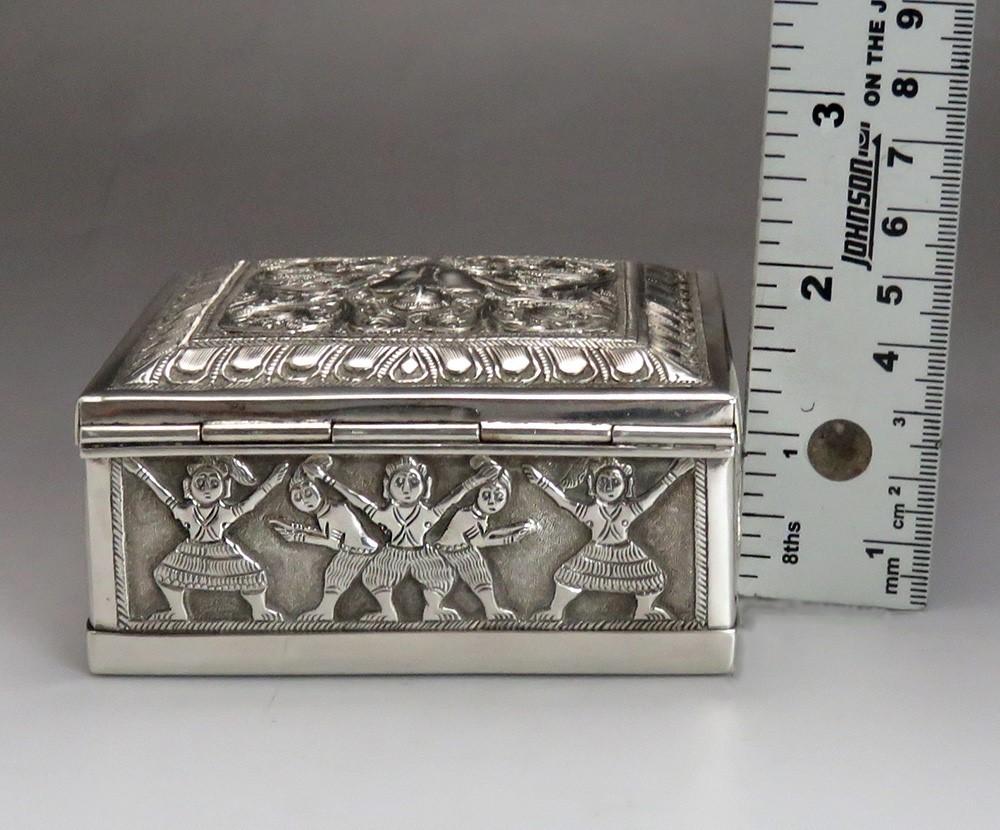 Presented is an old, Asian silver tobacco or cigarette box made during the first half of the 1900s. This piece is probably from Thailand and is guaranteed to be at least 900 purity silver. The box has a wooden liner on the inside and the construction of the box is very unique, as the bottom portion of the box overlaps and is securely pinned or riveted to the side of the box. The whole entire piece is completely hand chased with a deity on the top, dancing, tribal men around the sides and a good luck elephant on the underside.