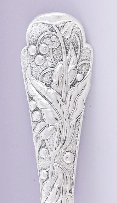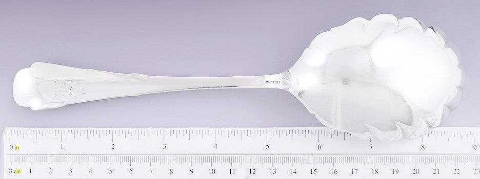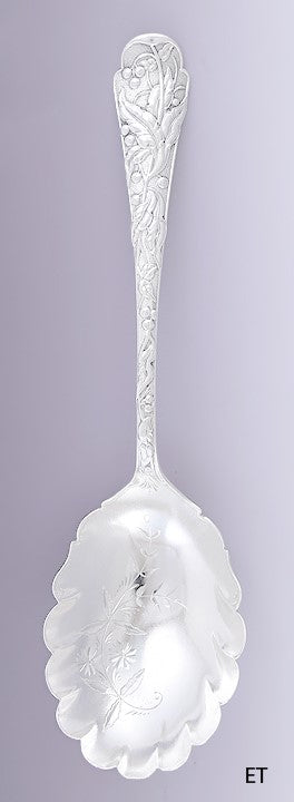 Presented is a beautiful JB & SM Knowles sterling silver serving spoon or scoop. This piece dates to around 1875-1885. The server is ornately decorated on the handle with a realistic design of berries and leaves on a long branch, all against a finely textured background. The bowl of the scoop has a scalloped edge. The interior of the bowl has a matte finish, with bright cut foliate designs for contrast. The back of the handle has a monogram of B in Gothic script.