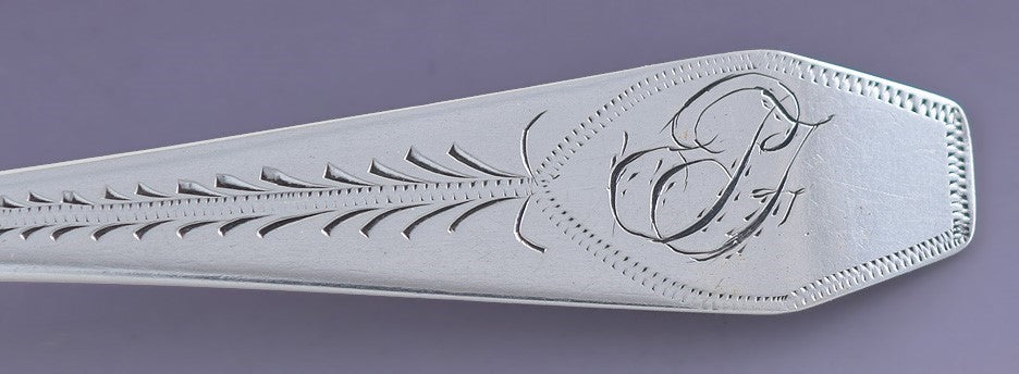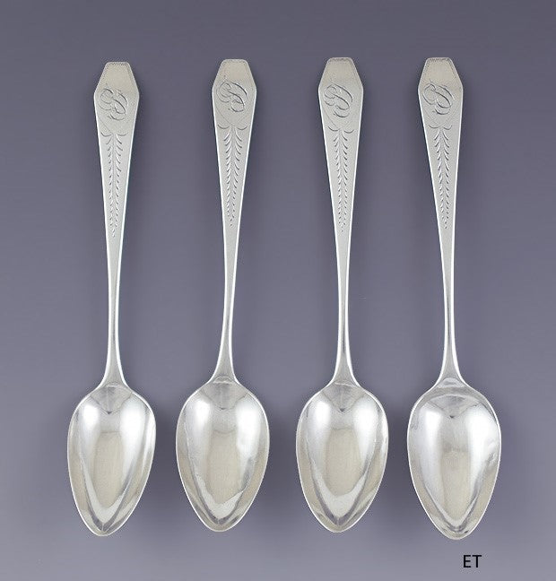 Presented is an antique set of 4 American coin silver tea or coffee spoons made around the very early 1800s. The handles are done in a Coffin End style and are hand engraved with design. Each spoon has an old, original monogram of the initials PF.