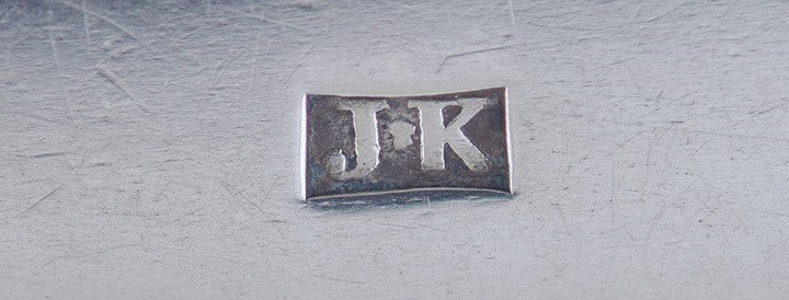 The back of each spoon bears a maker's mark of the initials JK. The spoons are guaranteed to be 900 purity silver.