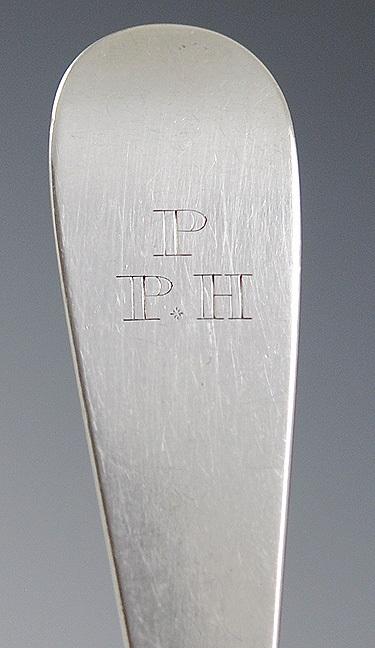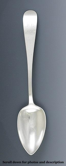 Presented is a very nice American coin silver serving spoon by Phillip Garrett. This piece dates to circa 1801-1835. This is a large, long-handled spoon, sometimes called a platter or stuffing spoon, and is appropriate for any general serving purpose. The spoon is done in a very simple and clean style. The handle is monogrammed with 'P P*H' on the handle. The spoon is quite sturdy and well made, from thick silver.