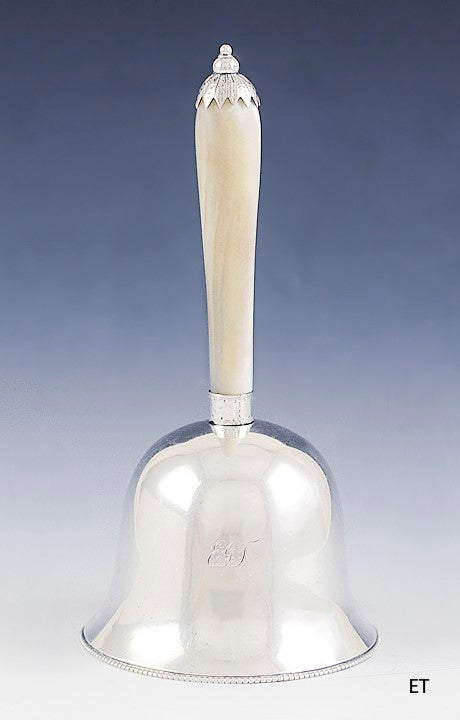 Presented is a fine China trade silver bell with mother-of-pearl handle. This piece dates to the early 1800s. The bell is done in a simple classical style with a beaded rim. The handle is beautifully made from mother-of-pearl, with a flower form silver cap on the end.