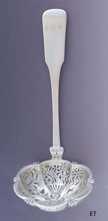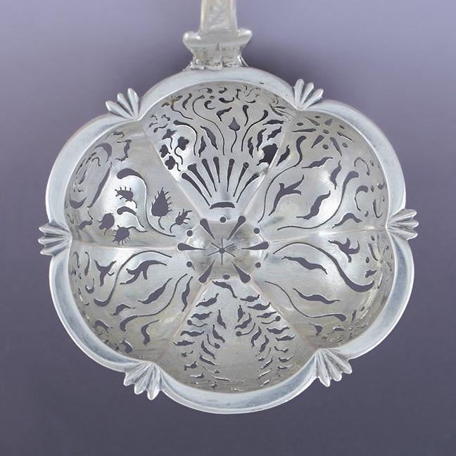 Presented is a fabulous German 800 silver pierced ladle or sugar sifter, dating to the mid 1800's. The bowl of the ladle is done in a lovely six lobed design, with little fan shapes in the indentations between the lobes. The bowl is intricately pierced with floral and foliate shapes, different in each panel. The handle has a monogram of TWH in Gothic lettering.