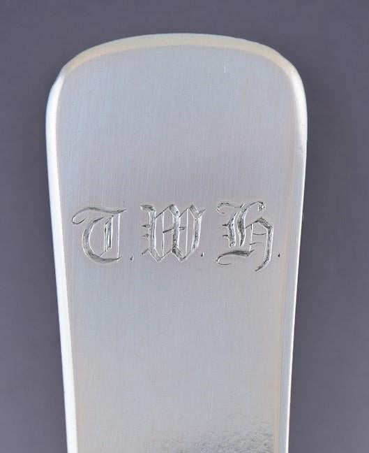 This piece is in great overall condition. The handle has a reinforcement on the back where it meets the bowl, where the handle likely broke off in the past, but this reinforcement is very well done and sturdy. There are no other repairs, no splits, and no monogram removals.