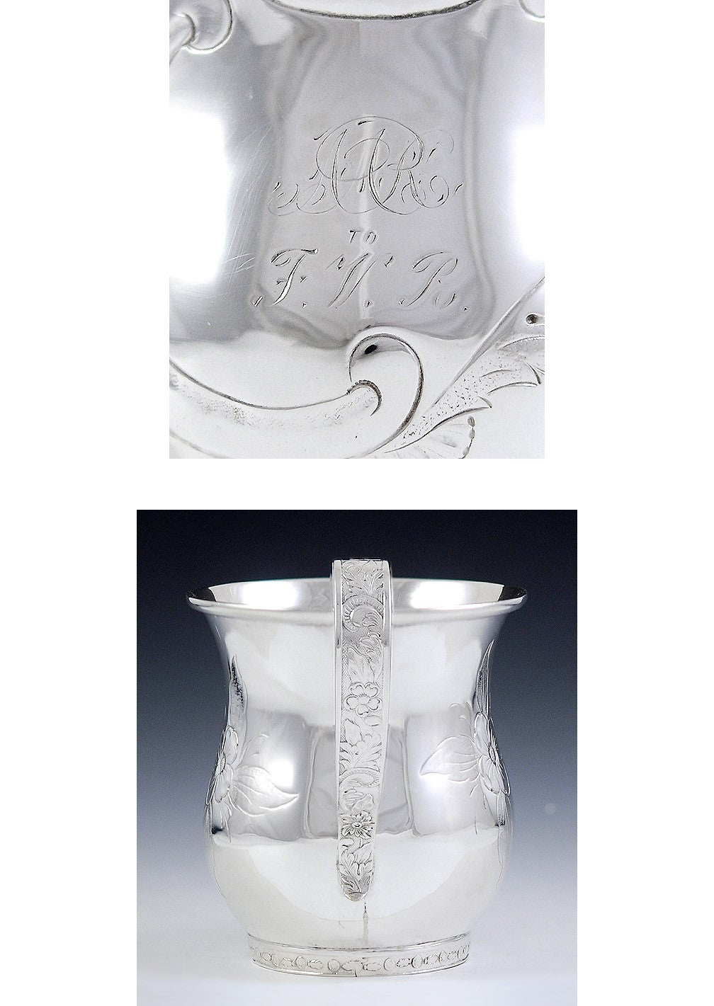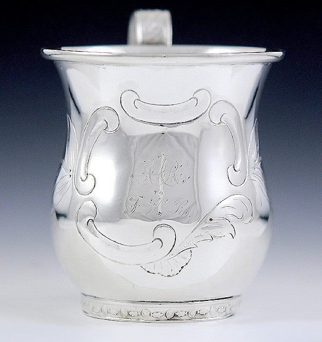Presented is a super quality American coin silver mug or cup. This piece is beautifully hand chased around the body in very pretty flower designs with nice stippled work. The base of the mug and handle have die-rolled and applied decorations. The large center cartouche is engraved with the monogram AAR to FVR.