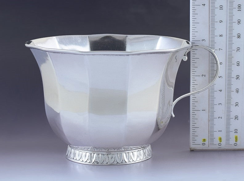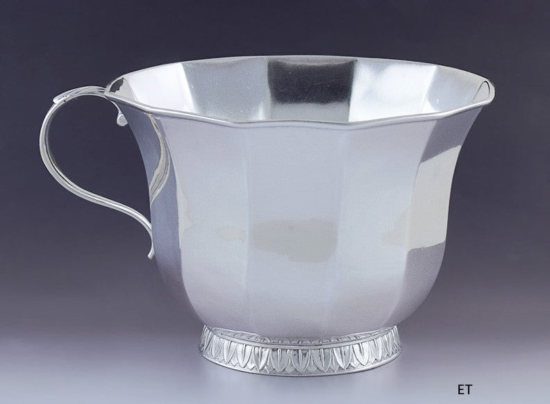 Presented is a lovely American coin silver cup or mug. This piece was made by Bard & Lamont of Philadelphia, and dates to circa 1841-1845. The cup is done in a handsome paneled form, with a classical egg and dart border applied around the foot. The cup has a single handle done in a nice scrolled form, with a foliate thumbpiece.