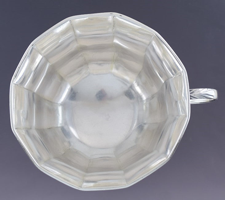 This piece is in great overall condition. There has been a presentation inscription removed from the side, but this was well done and the silver is still sound. The bottom juncture of the handle and possibly the top juncture as well have been resoldered, but this is quite hard to notice. There are no splits, no leaks, no dents, no monograms, and no other repairs.