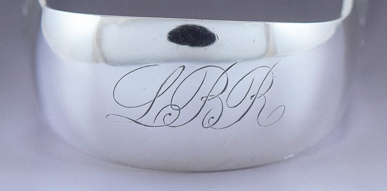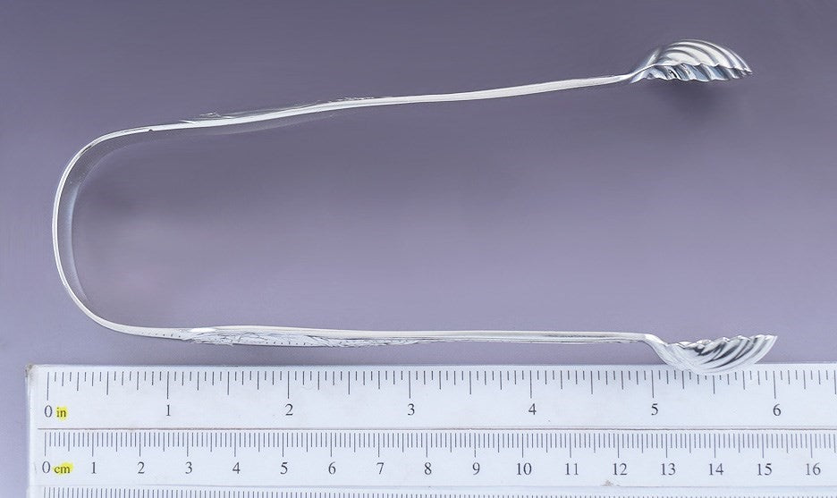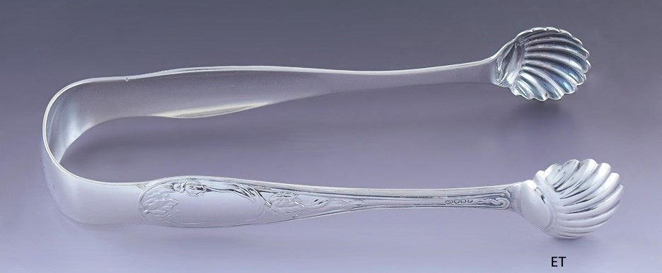 Presented is a great pair of American coin silver tongs. These tongs date to around 1850-1865. The tongs are done in a more decorative variant of the Olive pattern, which originated and quickly became popular around this time period. The tongs have nice scallop shell form ends, undoubtedly intended for serving sugar lumps originally but great for ice or other serving purposes today. The pattern has an oval cartouche on both arms of the tongs, neither of which has ever been monogrammed, but the back of the tongs has a monogram of LBR in script.