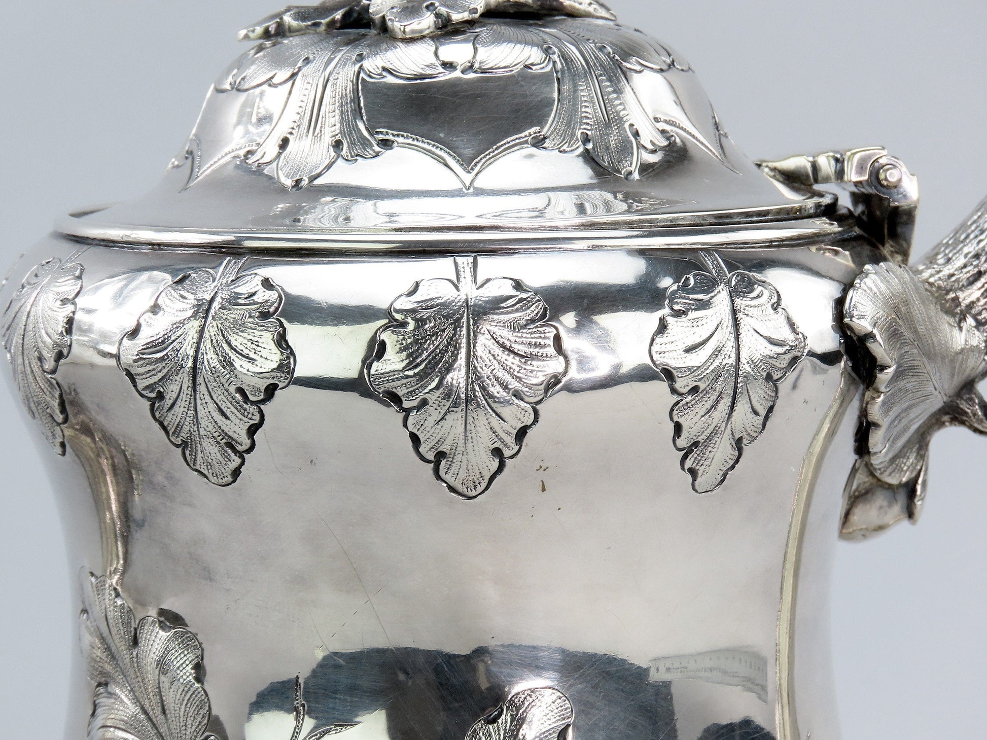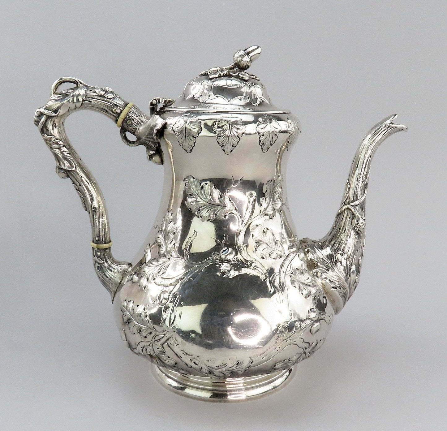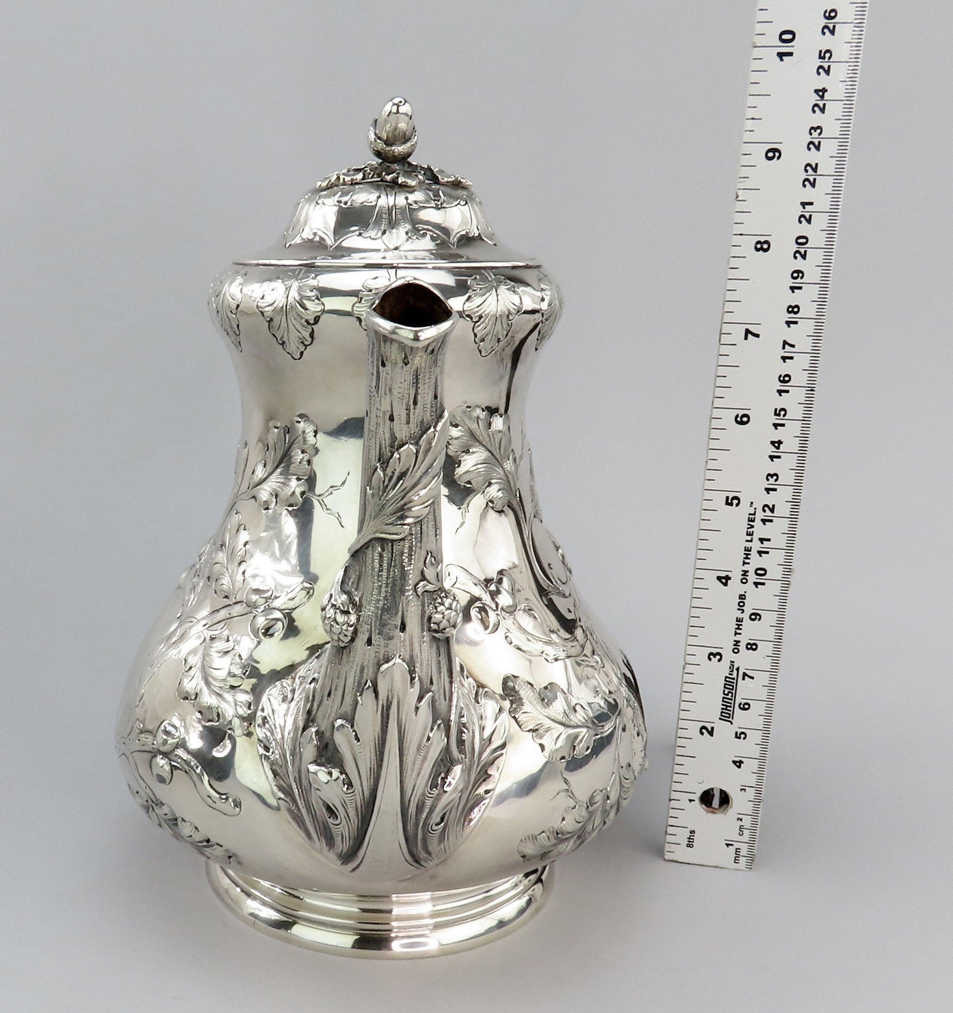 Antique c1850 American Coin Silver Large Coffee/Teapot Hand Chased Oak Leaves