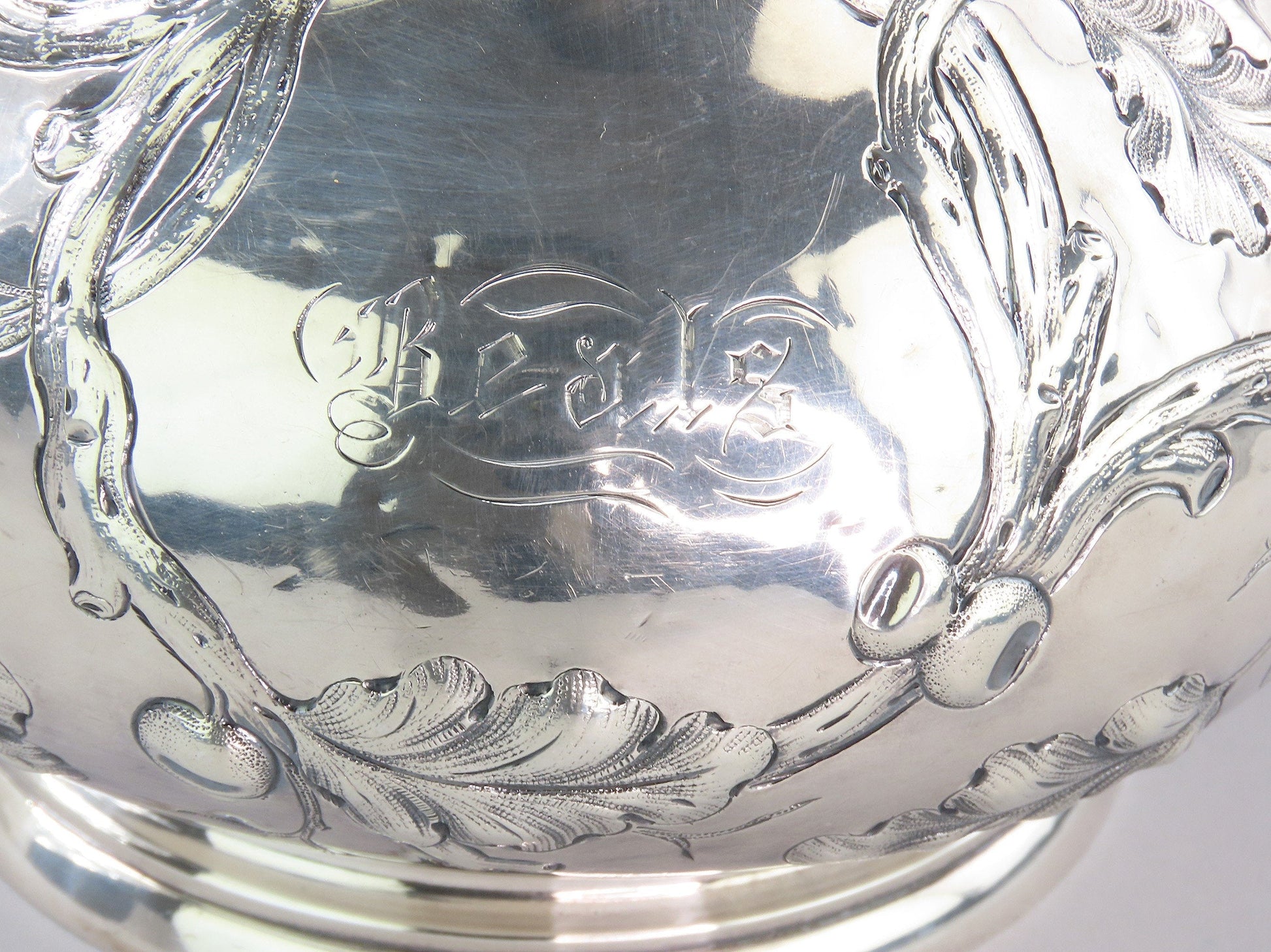 This piece is in great overall condition. The cartouche that has no monogram has been replaced. This removal was done by completely replacing the silver in that area. That way the silver was not thinned. It is quite difficult to notice this alteration, as it was well done and blends in to the border of the cartouche. There are a few minor dents around the front cartouche area. The decorations are crisp. There are no breaks and no other repairs.