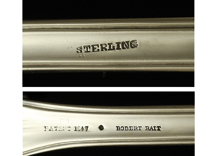 The ladle is marked on the reverse with Patent 1847, Sterling, and the retailer’s stamp of Robert Rait. Rait was a New York City retailer who was in business between 1830 to 1855. We believe that the Sterling mark was perhaps added many years after this ladle was made. When this ladle was made, between 1847 through the 1850s, very few pieces were being stamped sterling. We have tested this ladle and guarantee it to be at least 900 purity silver.