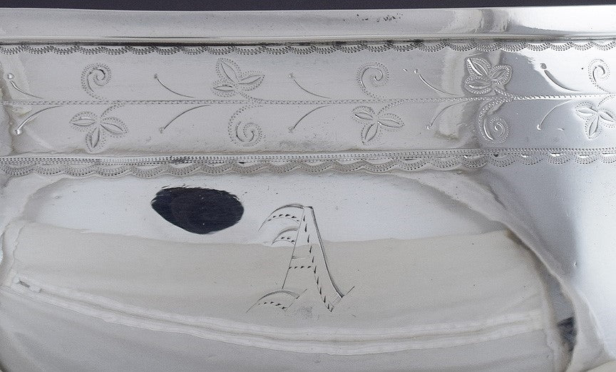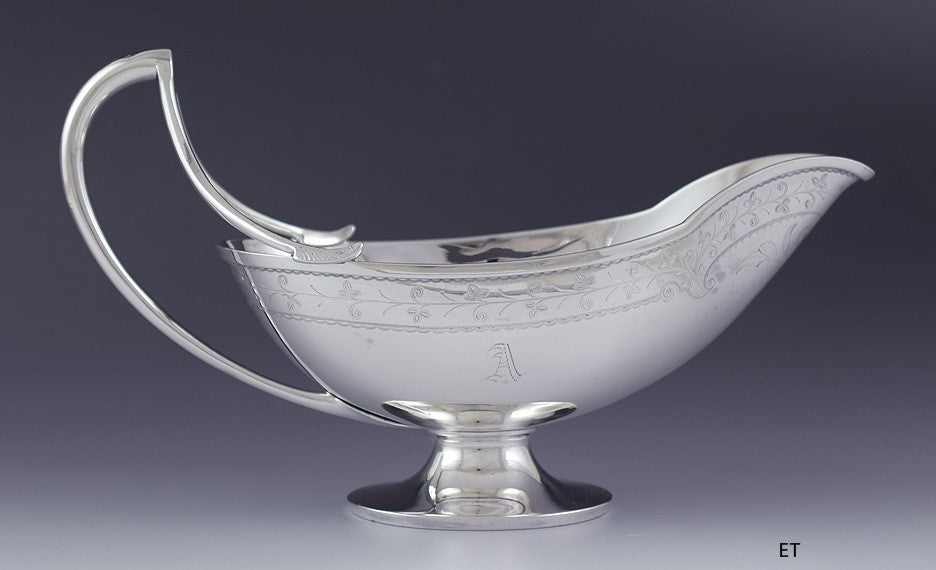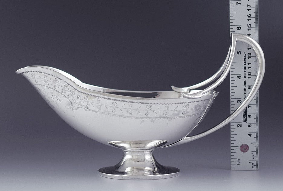 Presented is a fabulous Gorham coin silver gravy or sauce boat. This piece dates to around 1855-1860. The piece is done in an attractive classical style, beautifully hand engraved around the rim with a foliate design. One side of the gravy boat has a monogram of A. This is a very handsome and well constructed piece, made from thick, heavy silver with a nice feeling of weight in the hand.