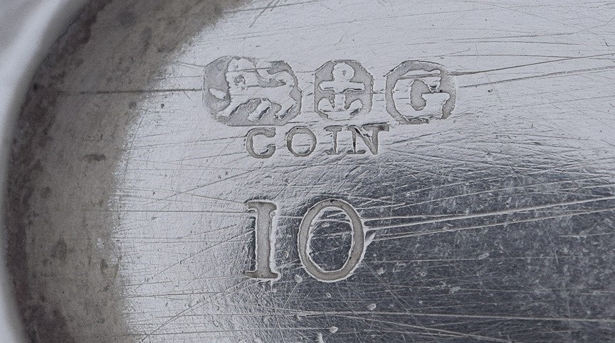 This piece is stamped on the underside with the Gorham maker's mark as well as "coin" for 900 purity silver.