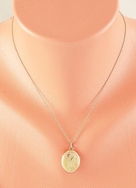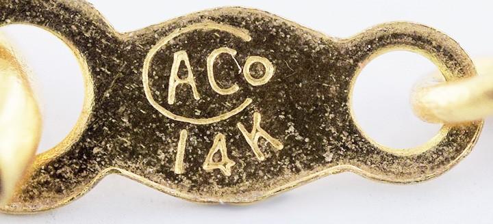 The chain is stamped and guaranteed 14k, with a maker's mark of C A Co. We have tested the locket with nitric acid and guarantee it to be 18 karat gold.