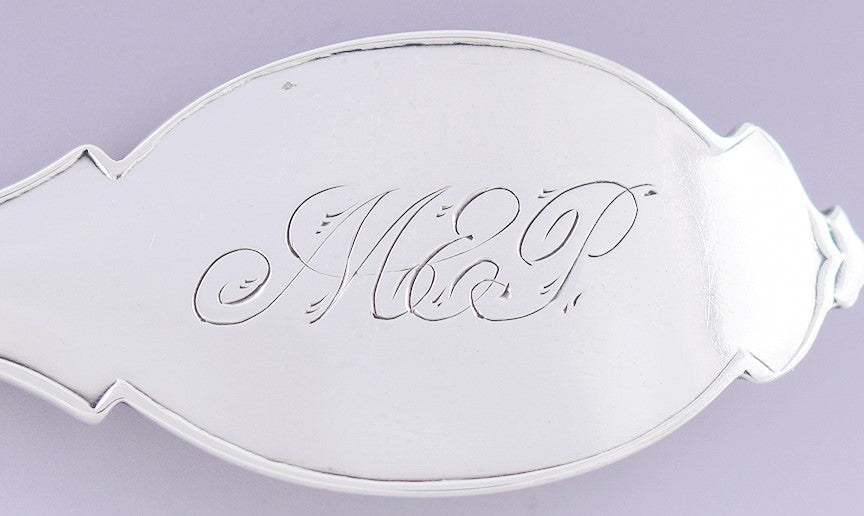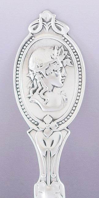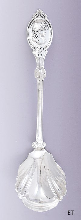 Presented is a lovely American coin silver sauce or gravy ladle. This piece is by Hotchkiss & Schreuder of Syracuse, New York, and dates to circa 1865. The ladle is done in a style similar to Gorham's 1864 Medallion pattern. The end of the handle has an oval medallion showing a classical Greco-Roman woman's head in profile, with a garland of leaves in her hair. The bowl of the ladle is done in an elegant shell form. The back of the handle has an MEP monogram.