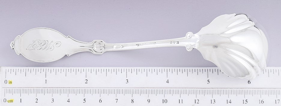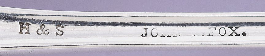 The ladle is stamped on the stem with the maker's mark for Hotchkiss & Schreuder, a Syracuse New York maker, and the retail mark of John F. Fox.