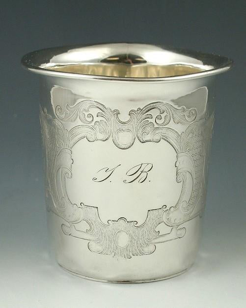Presented is a fine pair of Austro-Hungarian silver cups. The cups are decorated with nice scroll and leaf engraving surrounding a central cartouche. One cup is monogrammed JB, and the other is monogrammed NB, probably for a husband and wife. The other side of the cup is engraved “g.m.a.R.z.n”.
