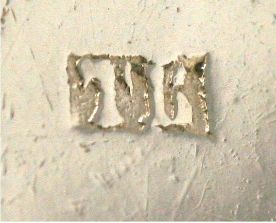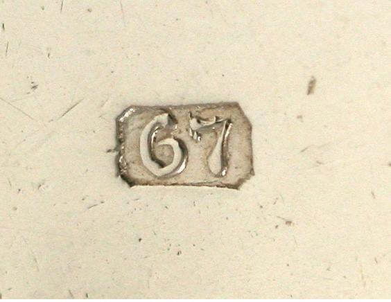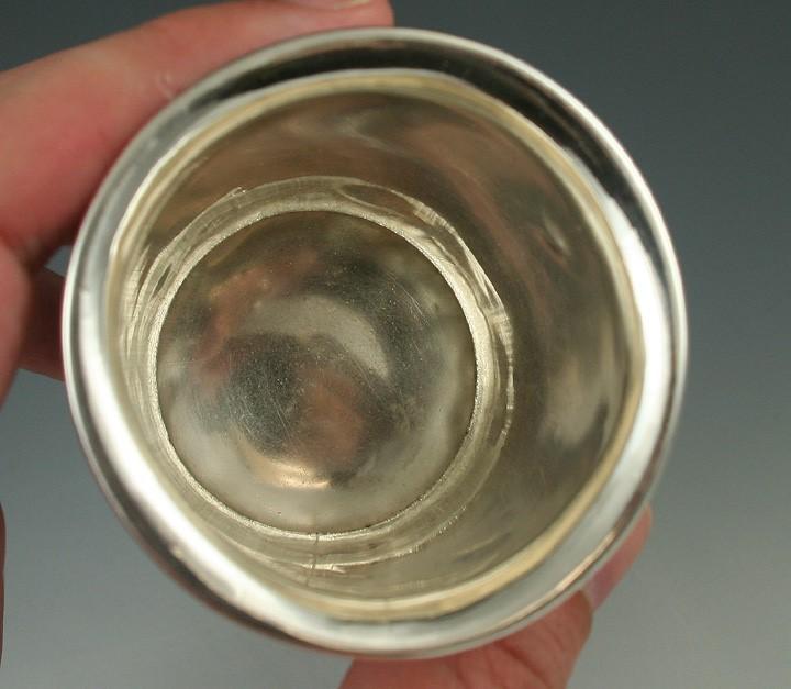 The cups are stamped on the underside with the 13 ½ loth mark for 840 purity silver, 67 probably for the date 1867, and a maker’s mark of TB. These pieces are either Austro-Hungarian or German in origin.