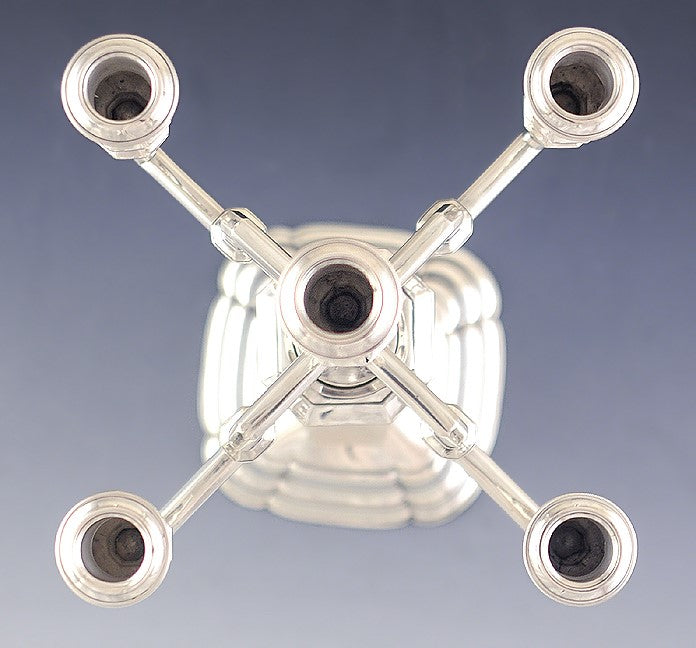 Presented is a fine continental European silver convertible five light candelabra. This piece dates to around 1860-1880, and is probably German, though we aren't sure. The candelabra is done in an interesting angular-armed form, with a paneled shaft and stepped base. The candelabra can be converted to a single candlestick, making this a versatile decor piece. The bobeches or wax drips on all five of the top socles remove, for ease of cleaning. The base is heavily weighted for stability. The underside of the base has green felt to protect scratchable surfaces. This piece is in good overall condition. There are some minor solder repairs around the main socle, which are very hard to notice. There are no other issues whatsoever.